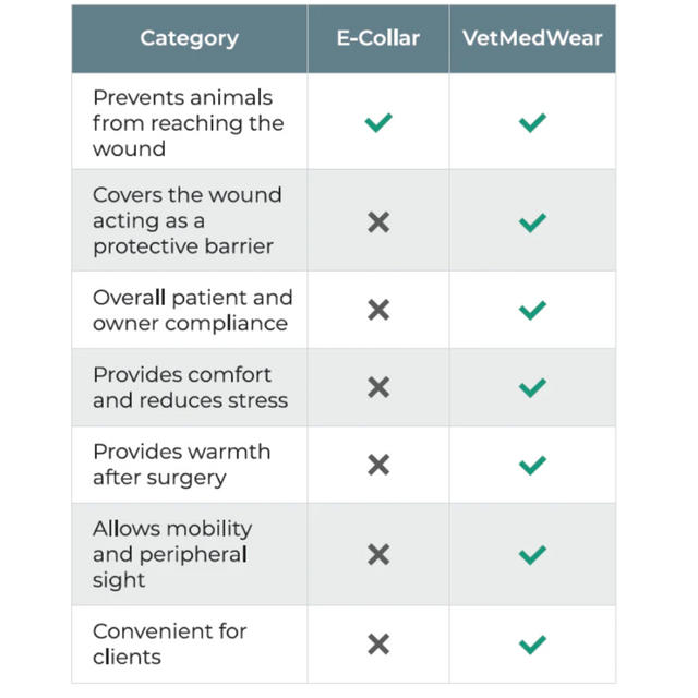 About 90% of the time, my clients choose VetMedWear! We have found we have a much higher owner compliance rate and have dramatically reduced the post-op complications by using VetMedWear.”